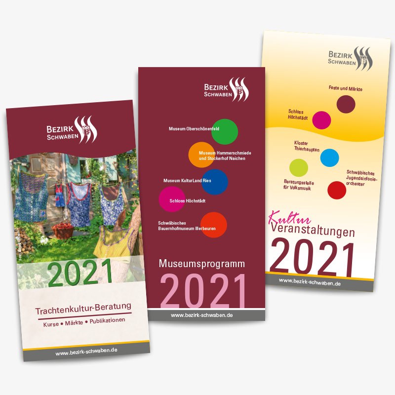 Wie schon im vergangenen Jahr durfte ich auch heuer wieder drei Programmhefte für den Bezirk Schwaben layouten. Es handelt sich um die Jahresprogramme 2021 für die Museen, das Veranstaltungsprogramm des Bezirkes sowie das Jahresprogramm der Trachtenkulturberatung. 128 Seiten voll mit spannenden Ausstellungen, Konzerten, Kursen, Veranstaltungen und Festen.