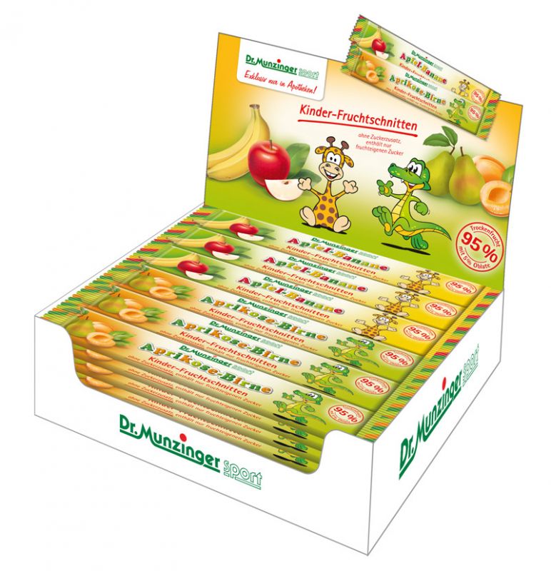 Seit Jahreshälfte am Markt: die neuen Kinder-Fruchtschnitten aus dem Hause Dr. Munzinger sport. Diese komplett neu ins Leben gerufene Produktlinie wird – genauso wie die klassischen Fruchtschnitten von Dr. Munzinger - in Apotheken verkauft. Zum Verkaufsstart wurde auch gleich noch ein neues Thekendisplay als Eye-Catcher gestaltet.