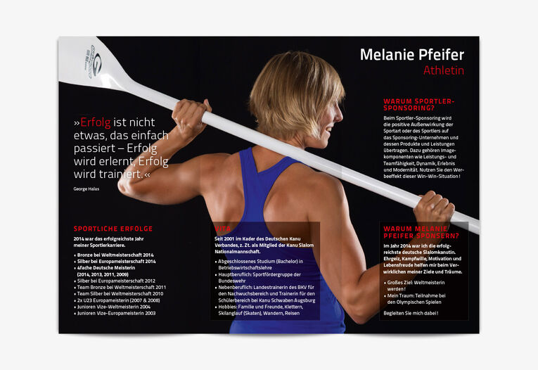 Melanie Pfeifer behauptet sich in 2014 mit Ergebnissen wie WM-Bronze, EM-Silber und als vierfache deutsche Meisterin solide an der Weltspitze des Kanuslalom-Sportes. Zur Präsentation als Athletin und zur Gewinnung von Sponsoren beauftrage mich Melanie mit dem Konzept und der Gestaltung eines Image-Prospektes.