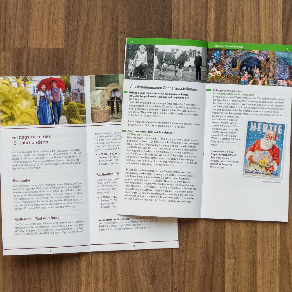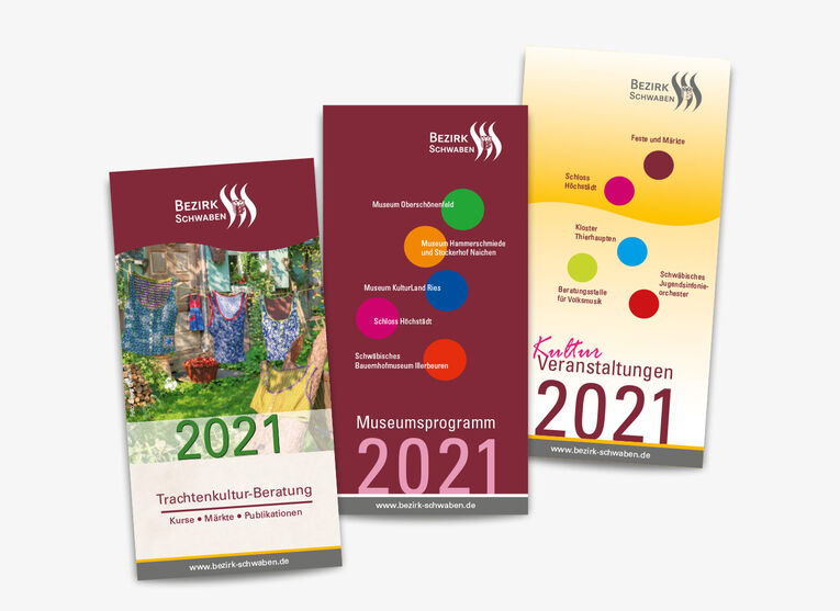 Für den Bereich „Kultur“ des Bezirkes Schwaben durfte Boschmedia drei Jahresprogramm-Hefte im DIN lang-Format setzen und bis zur fertigen Druckvorlage produzieren. Das Design war durch die Corporate Design-Richtlinien des Bezirkes Schwaben vorgegeben. Die Programmhefte haben einen Umfang von 36 bis 52 Seiten und enthalten alle Termine, Veranstaltungen, Museen und Ausstellungen, die der Bezirk Schwaben für das Jahr 2020 zu veröffentlichen hatte.