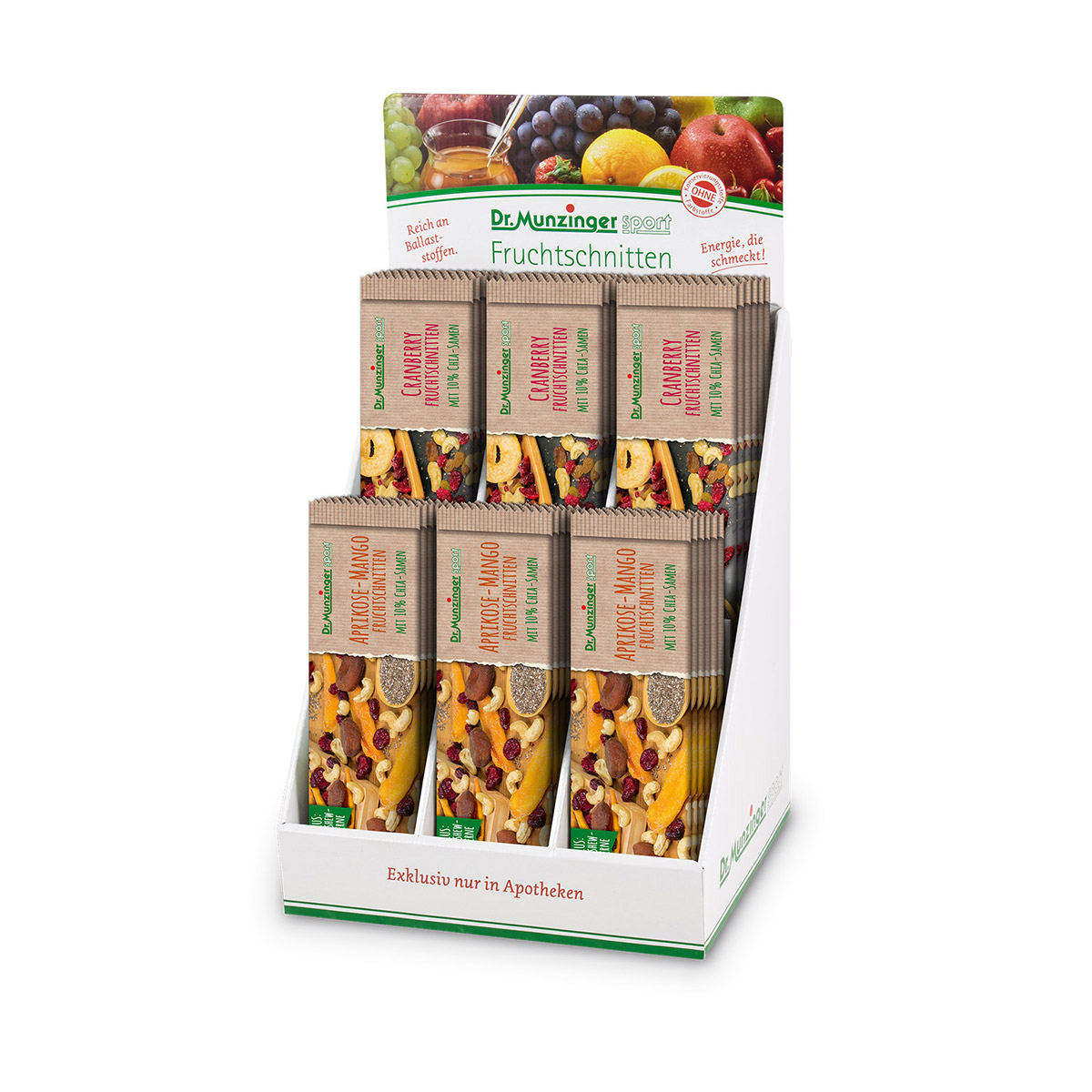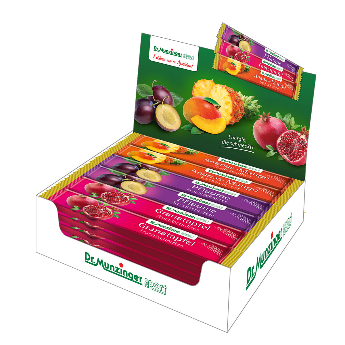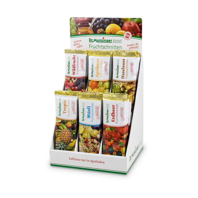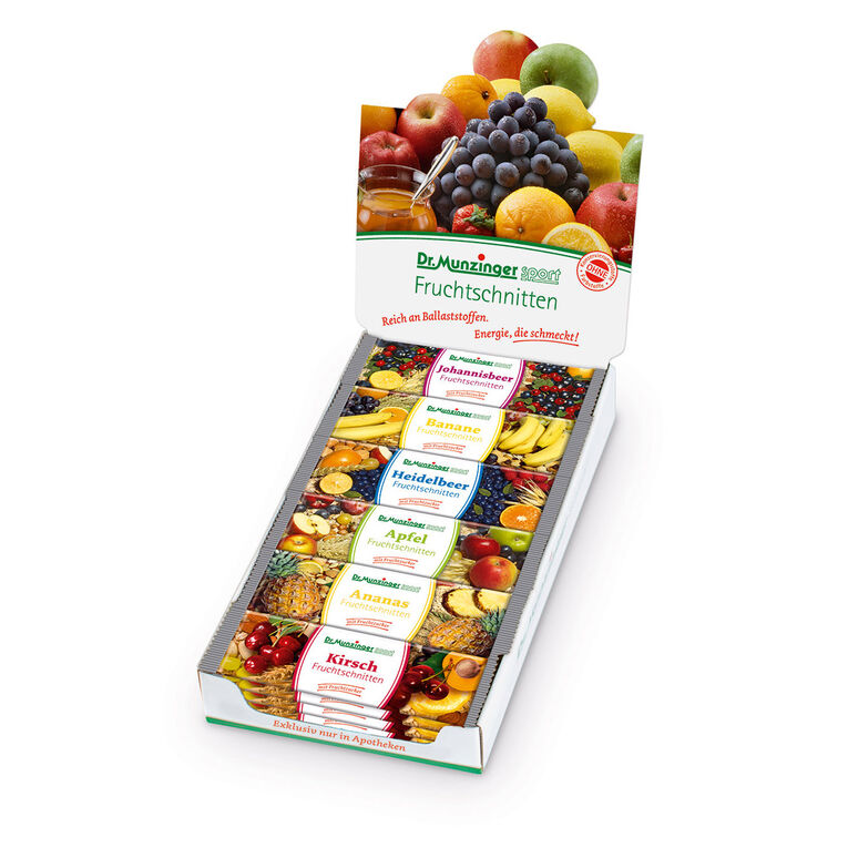 Boschmedia betreut seit 2011 das Corporate Design der Dr. Munzinger Sport GmbH & Co. KG. Schwerpunkt der Arbeit ist die Gestaltung von ansprechenden Verpackungsfolien und Thekendisplays. Dr. Munzinger Sport Produkte werden hauptsächlich über Apotheken vertrieben. Jeder kennt die leckeren Fruchtschnitten, die das bayerische Unternehmen seit über 30 Jahren produziert.