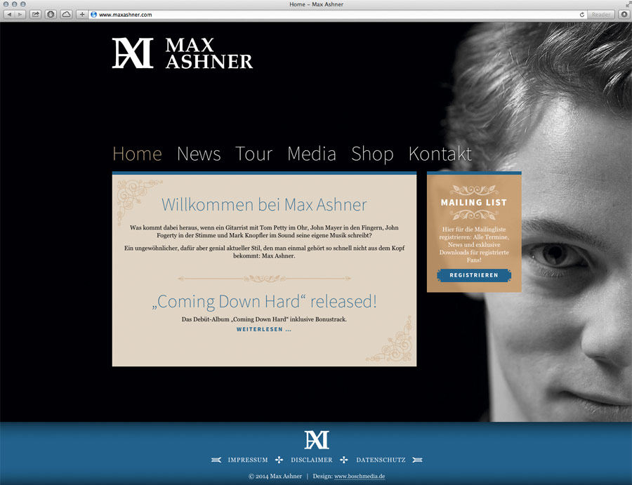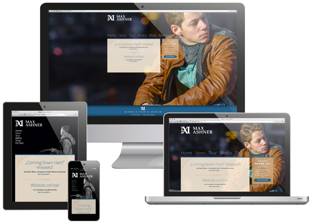 Ein Auftrag ganz nach meinem Geschmack: Design und Umsetzung einer Website, die das Feeling und den Anspruch der Musik von Max Ashner transportiert. Mit Newslettertool, Newsbereich, Termin-Engine, Galerien und mehr.